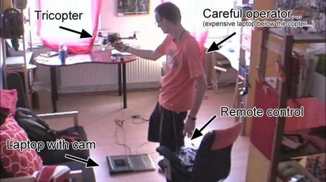 Gemacht wird das ganze mit einer Webcam, die den Copter von unten filmt. Es sind drei IR Leds am Copter befestigt, dadurch kann mein Laptop errechnen wo der Copter grad ist. Der Laptop sendet dann die Korrekurdaten an den Copter.