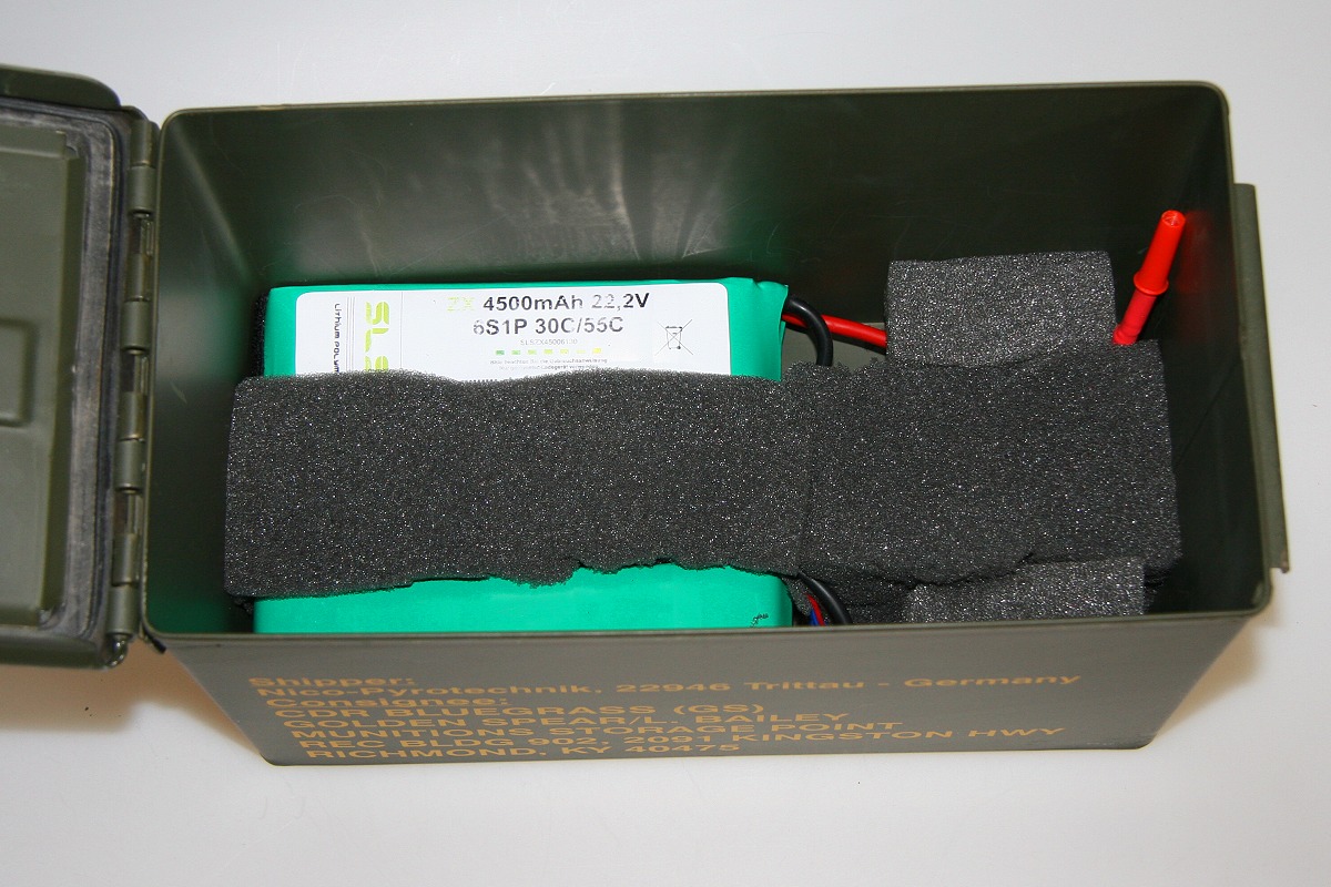 ... kurzum habe ich mir bei ebay zumindest jetzt eine sichere Aufbewahrungskiste gekauft (NATO-Kiste). Wenn die Pole jetzt die Kiste berühren, bin ich zwar wieder Feuer und Flamme für mein Hobby, aber dann weiß ich wenigstens, wo die Akkus liegen ...