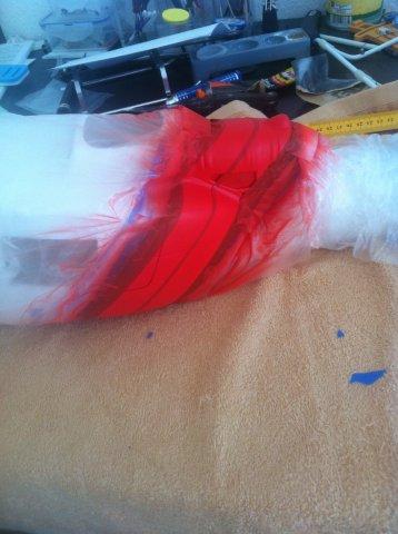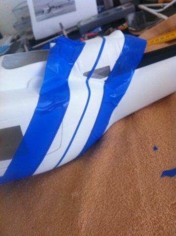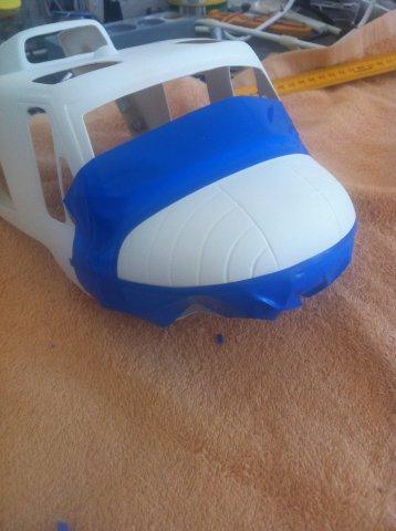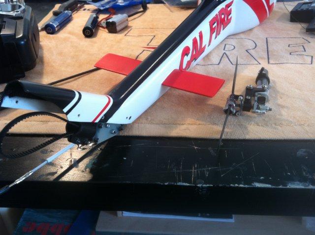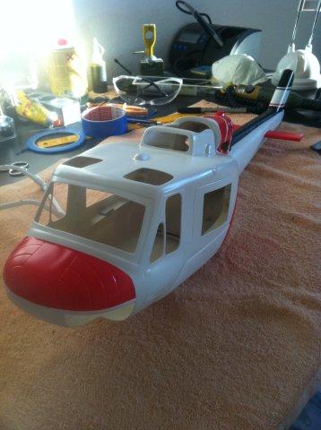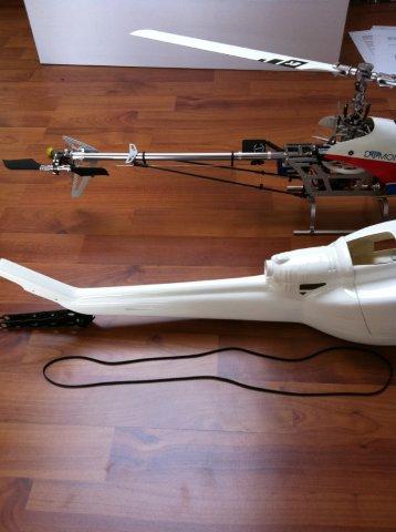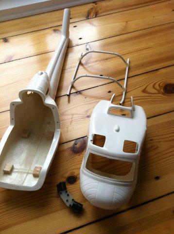 Irgendwann kam der große Tag und der Rumpf war da und auch gleich die erste Herausforderung: der Riemen passt nicht mehr. Denn die Huey besitzt ein höhergelegtes Heck und der beim Rumpf beiligende Riemen ist für den T-Rex ausgelegt.